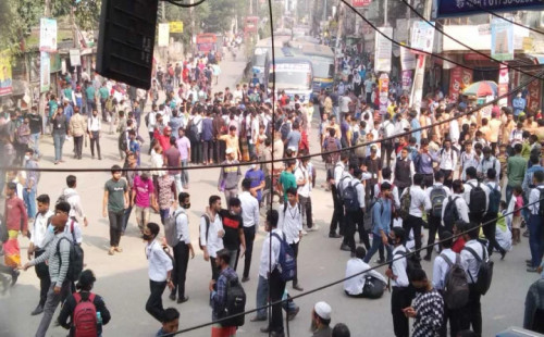 ‘হাফ পাস’ ভাড়ার দাবিতে মোহাম্মদপুর বাসস্ট্যান্ডে শিক্ষার্থীদের অবরোধ
