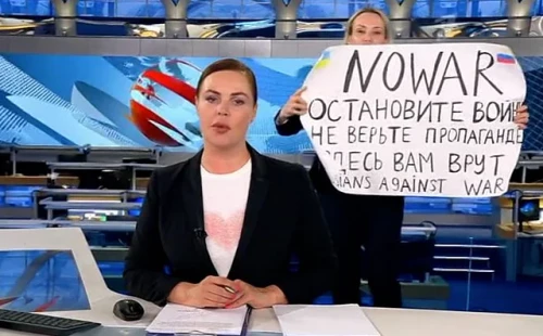 রুশ টিভিতে সংবাদের লাইভে ঢুকে যুদ্ধবিরোধী বিক্ষোভ